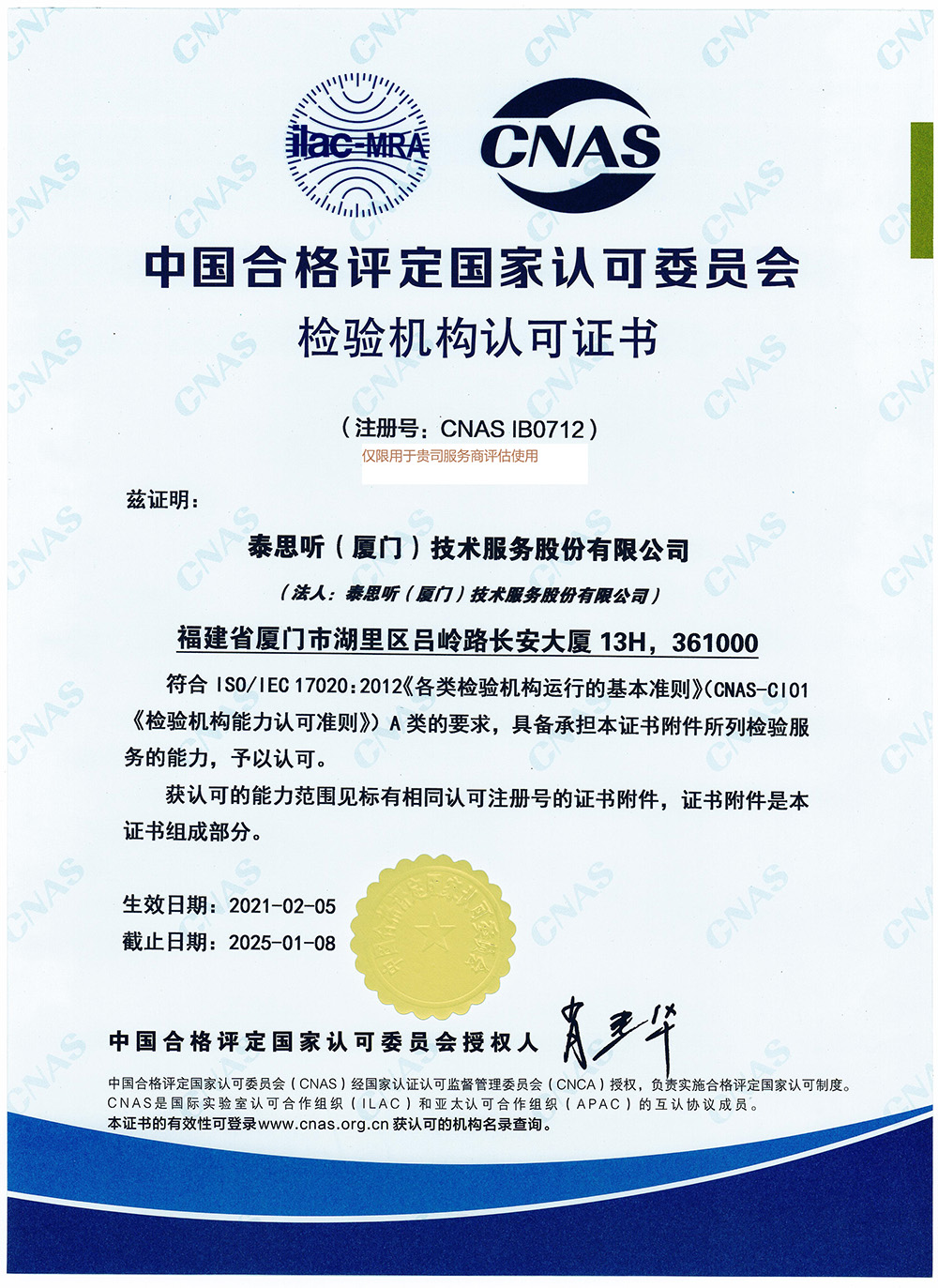 Ang TTS ay mahigpit na sumusunod sa ISO/IEC 17020 system standard para sa pamamahala at na-accredit ng CNAS at ILAC certification. Karamihan sa mga miyembro ng TTS at mga inhinyero na may malakas na teknikal na background ay napakaraming karanasan sa mga nauugnay na kategorya.